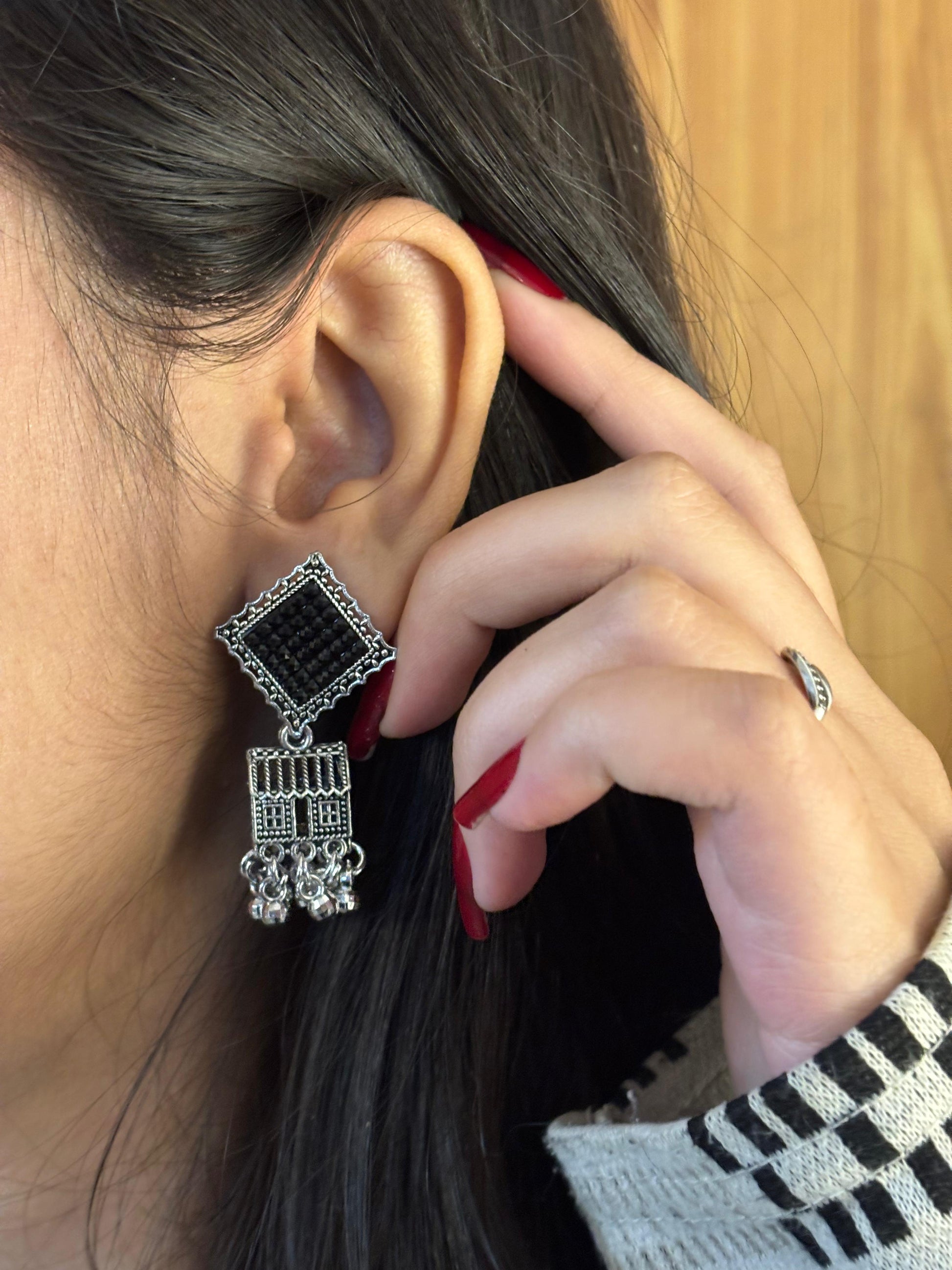 - Silver square & chain jhumka earrings β Square stone stud with chain-linked mini jhumkas and oxidised detailing.
