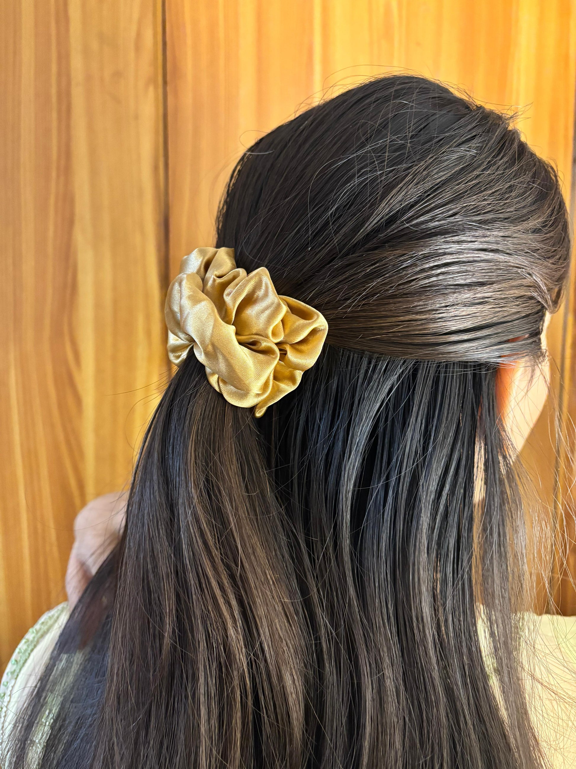 - Gold satin scrunchie β Elegant satin scrunchie in a rich gold tone.