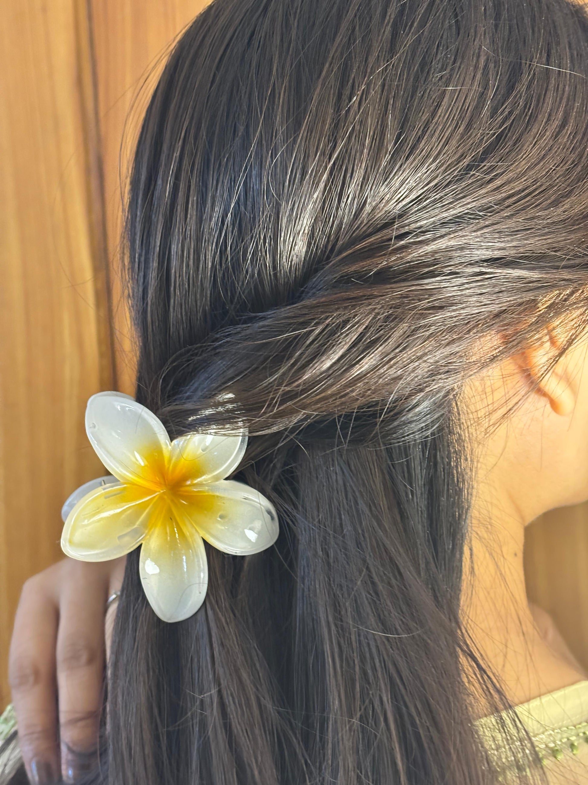 - White-yellow translucent flower hair clip β Large floral hair accessory with a soft yellow center gradient.