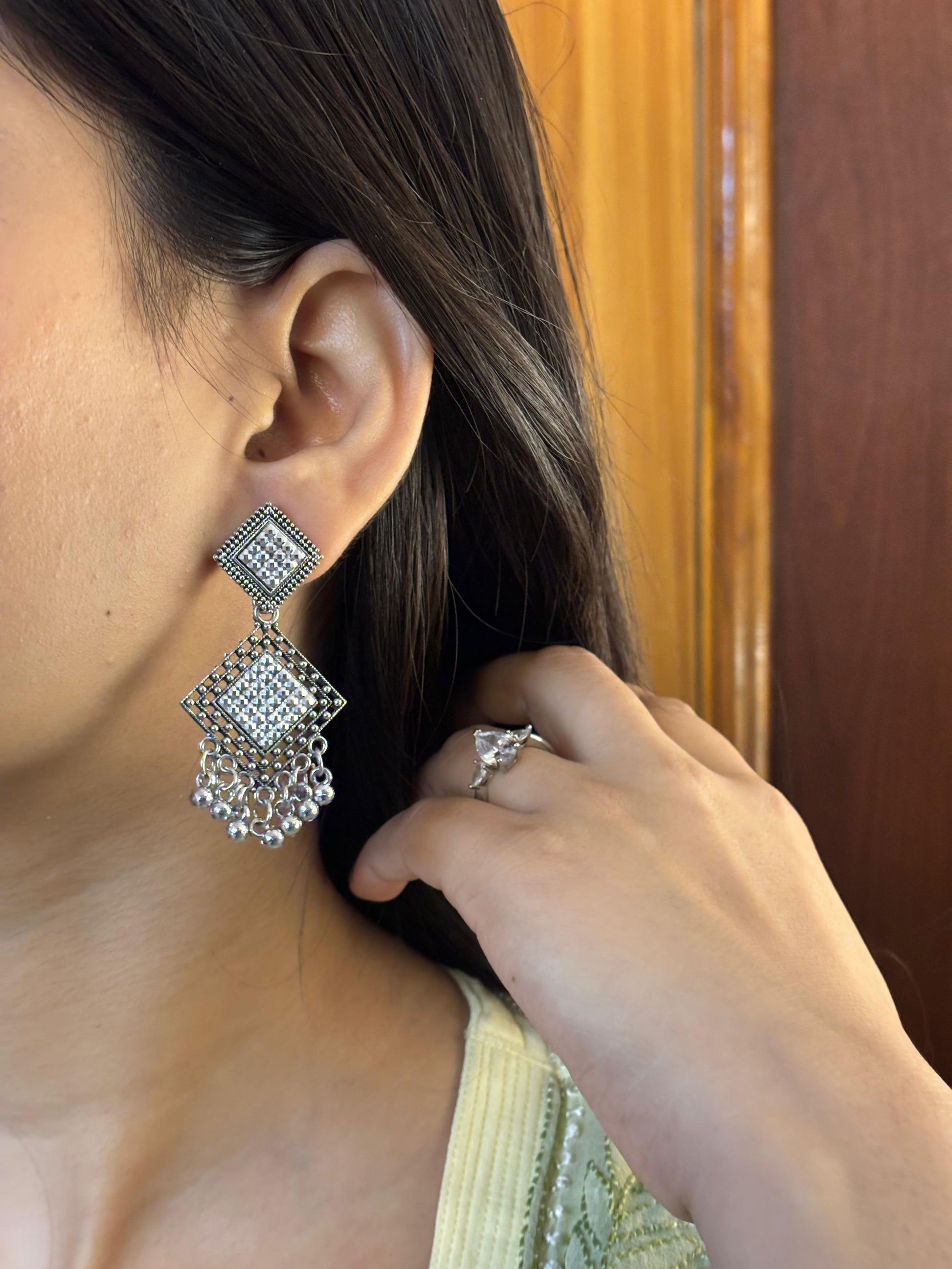 - Oxidised square jhumka earrings β Square oxidised stud with layered dangling bead elements.