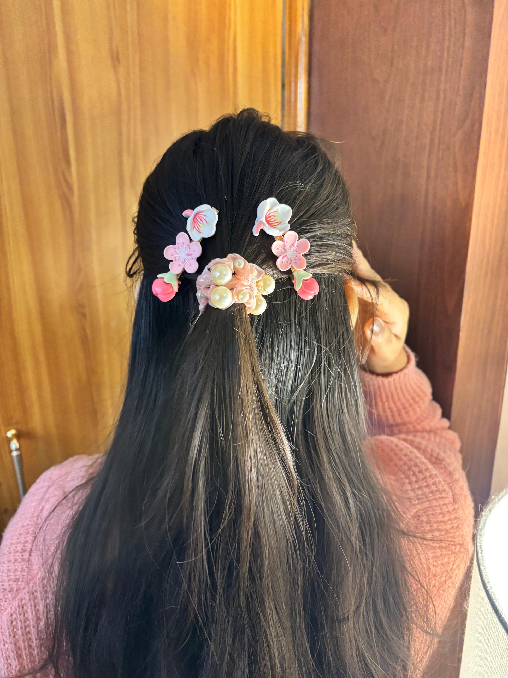 - Pink flower hair clips (pair) β Translucent pink floral hair accessories with a soft glossy finish.