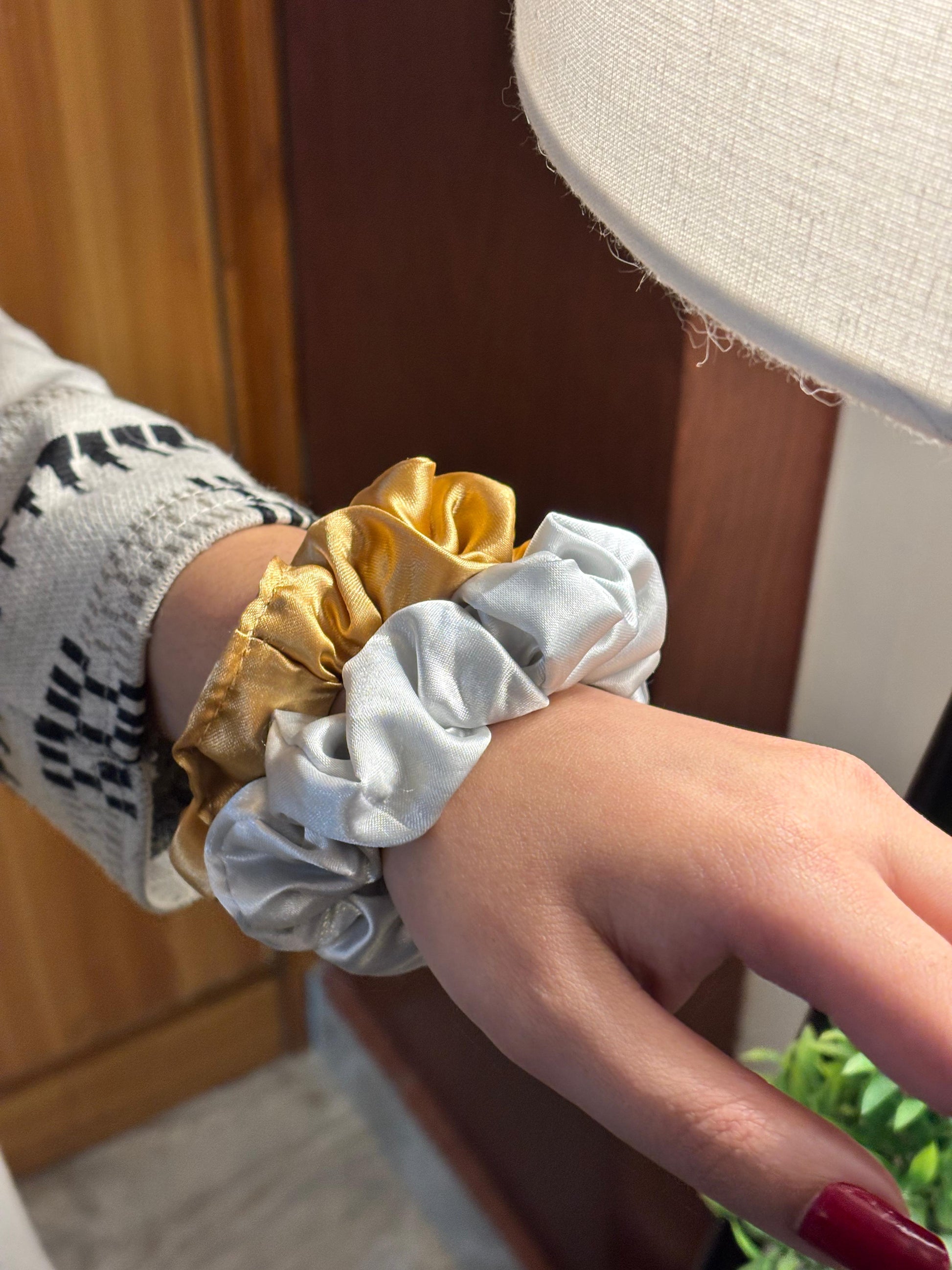- Silver satin scrunchie β Soft satin scrunchie in a classy silver shade.