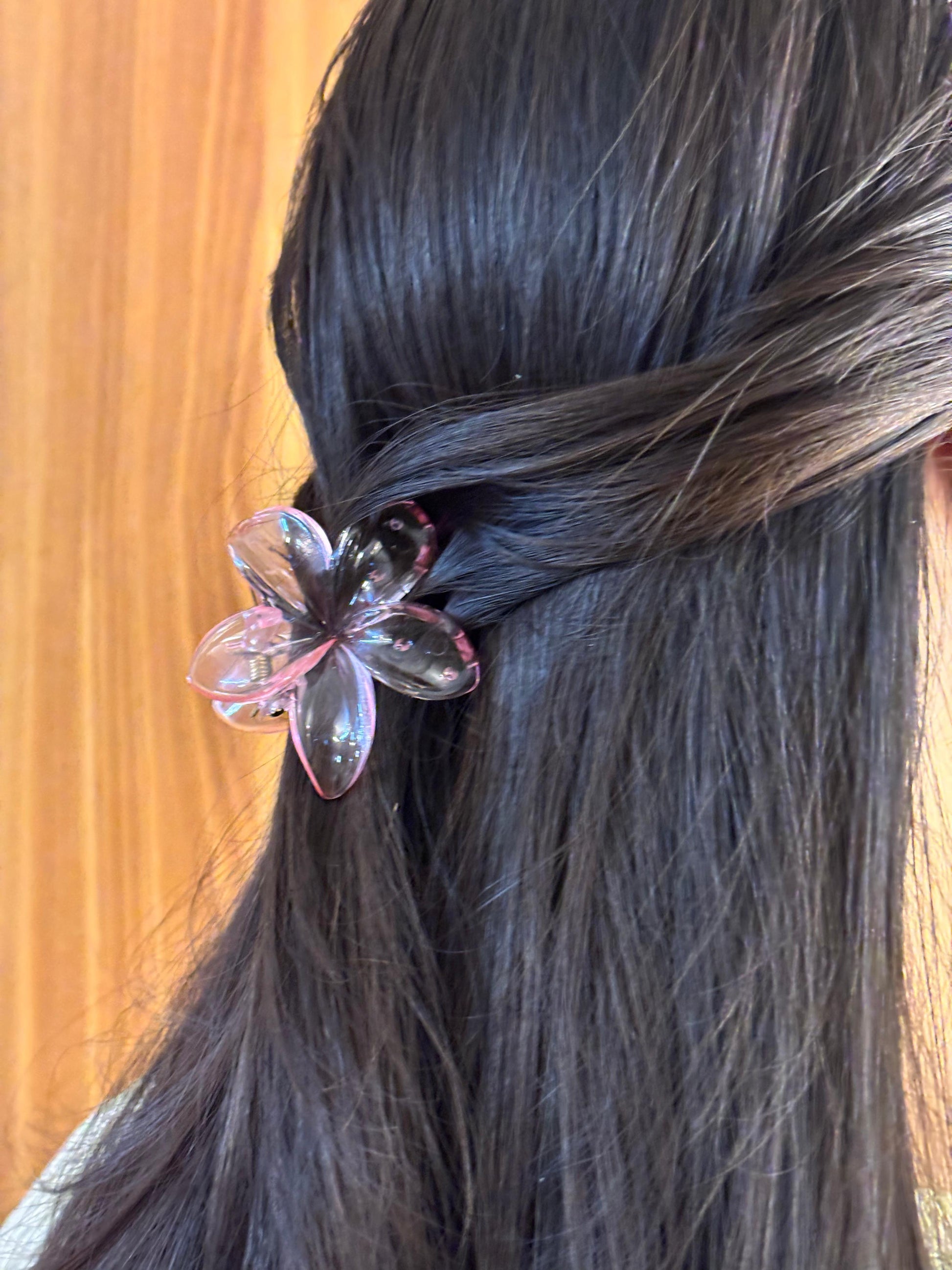 - Pink translucent flower hair clip β Large floral-shaped claw clip with a soft translucent finish.