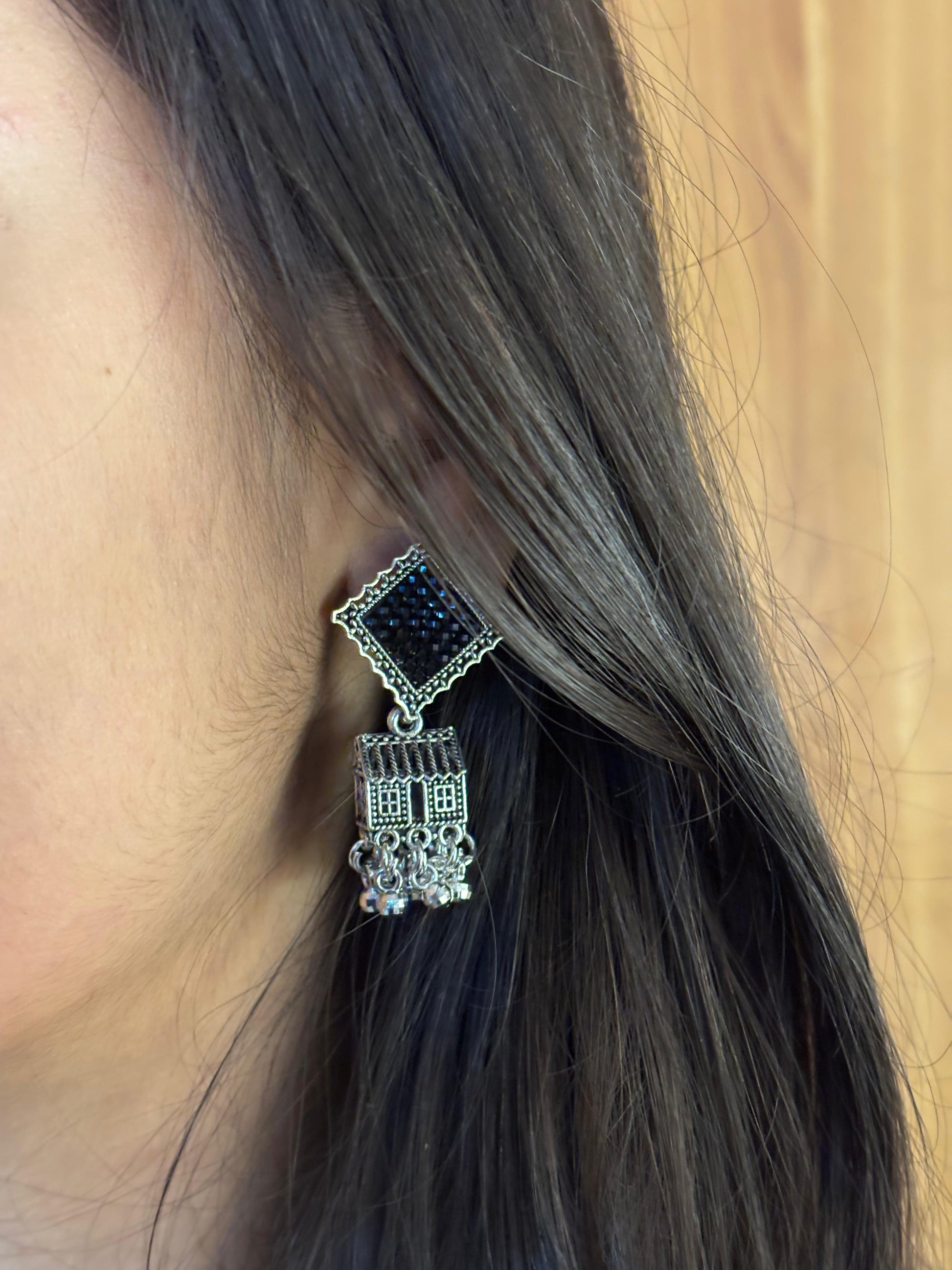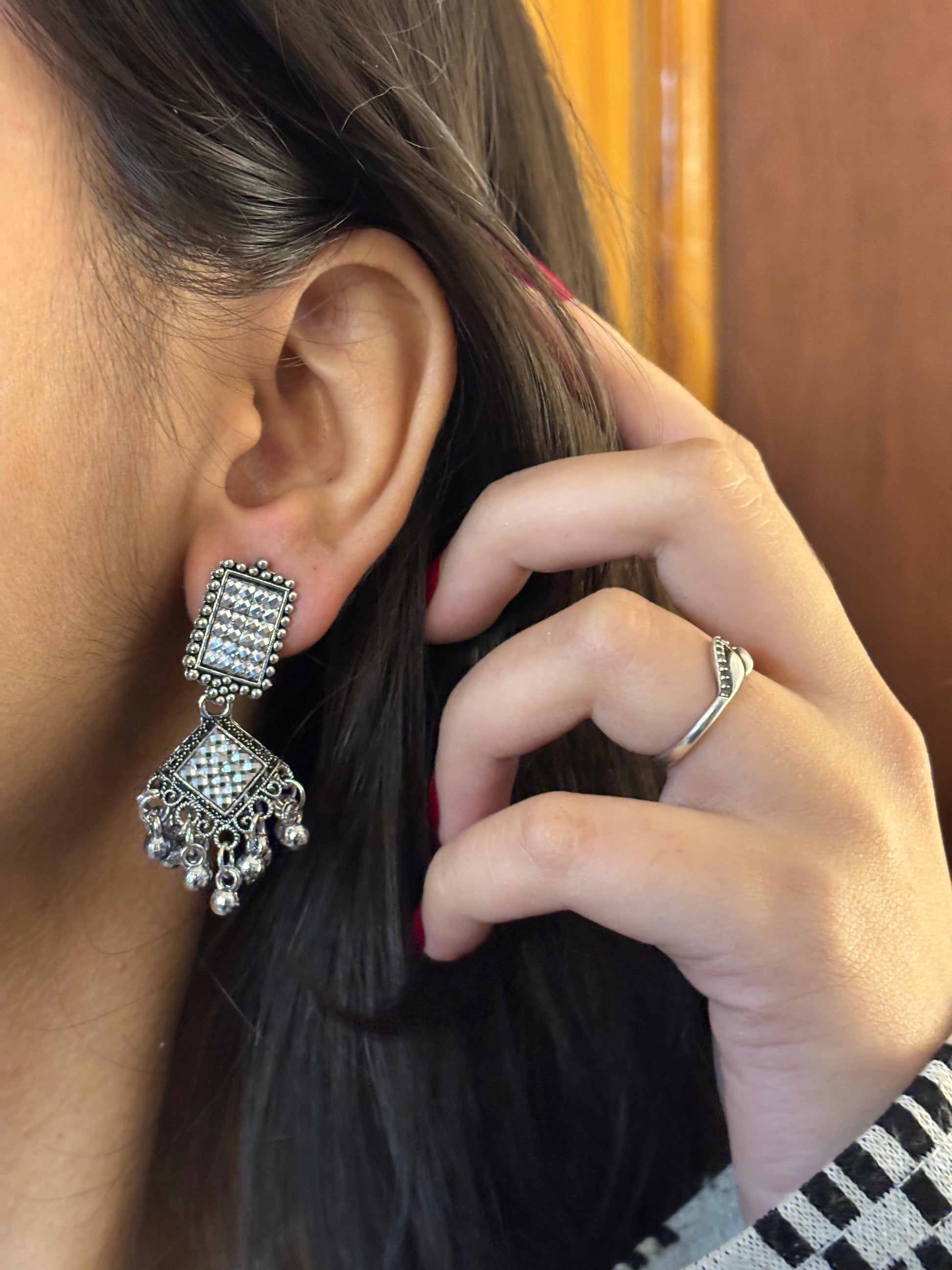 - Silver square jhumka earrings β Square crystal stud paired with an engraved square plate and hanging bead detailing.