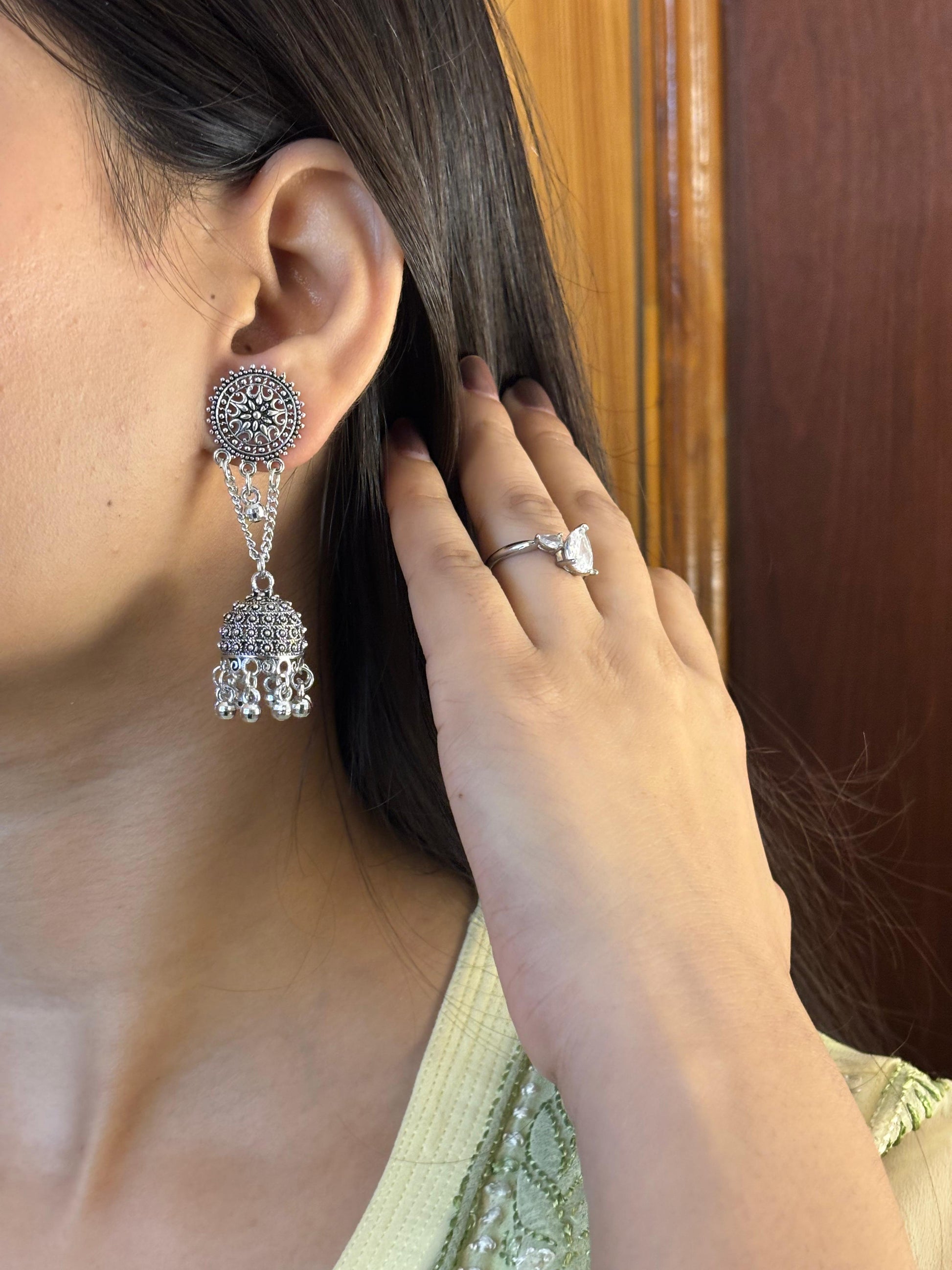 - Silver square & chain jhumka earrings β Square stone stud connected with chain-linked mini jhumkas for a layered look.