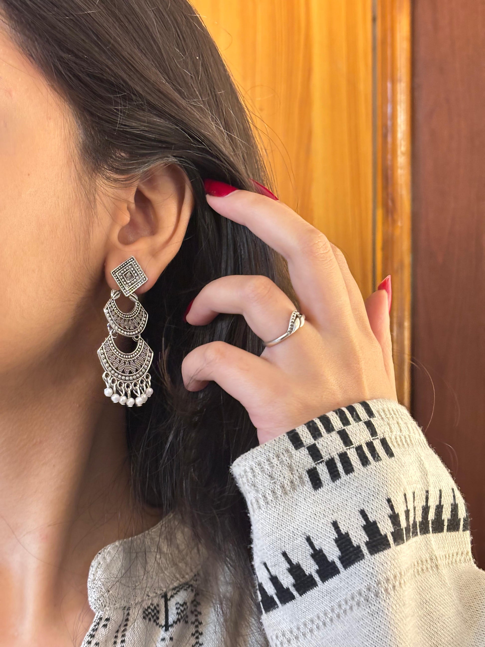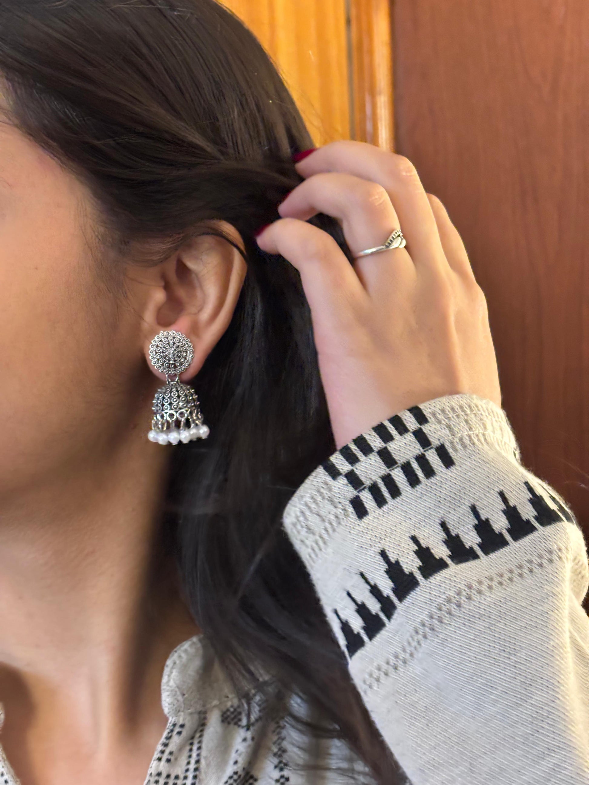 - Oxidised crescent jhumka earrings β Semi-circular oxidised design with hanging bead accents.